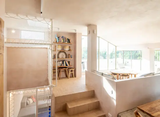 דירת נופש של לקוחות שעוזבים לחו״ל, עיצבתי את החלל סביב עדינות. רובו מחומר טדלק בכל הקומה הראשונה, ואלמנטים מיוחדים ויוצאי דופן ששילבתי בשביל הילדים, טיימלס זה